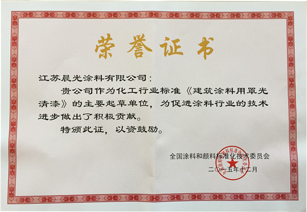 江苏PA视讯在线官网涂料在2015年中战绩喜人,作为《建筑涂料用罩光清漆》的主要起草单位,掌握着核心罩光漆研发技术,并因这一颇有含金量的科技实力,而成为化工行业罩光清漆标准制定的核心成员,被全国涂料和颜料标准化技术委员会授予“积极贡献奖”。