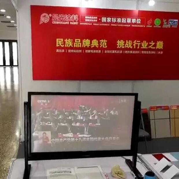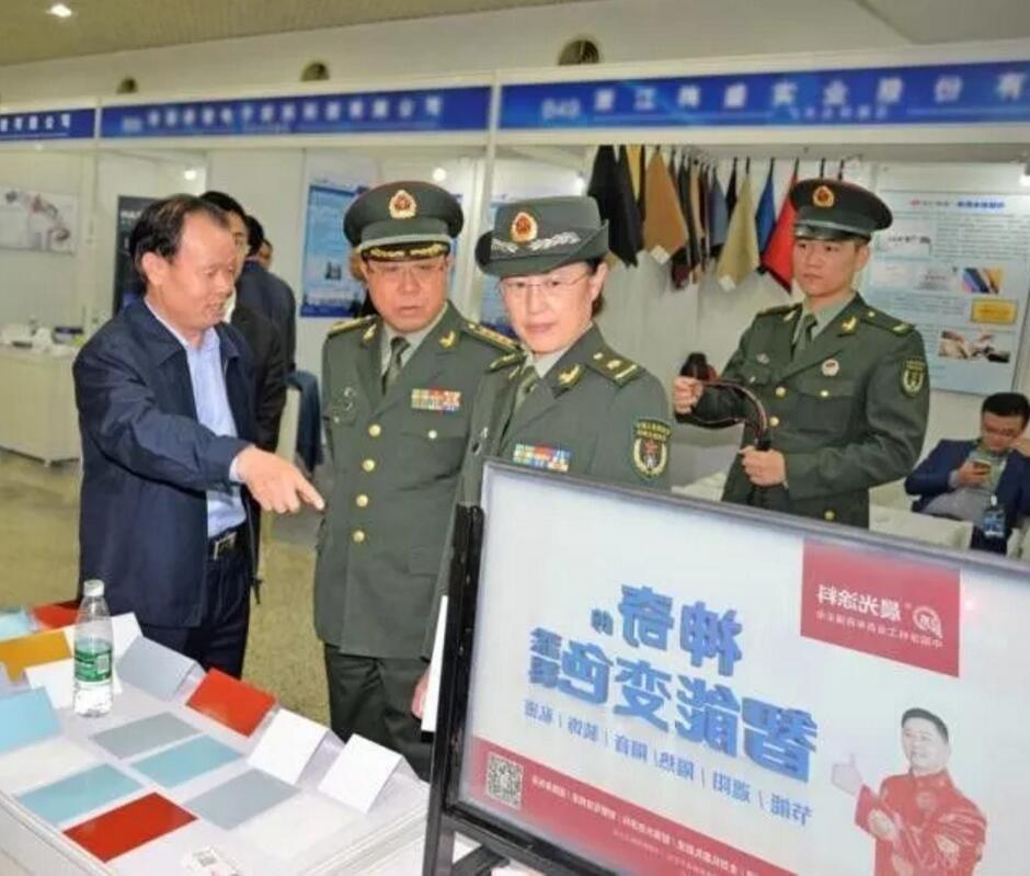 作为军民成果展,自然吸引了来自军队方面对于科技运用于新型军用装备的关注,开展首日,上海警备区司令员张晓阳现身PA视讯在线官网涂料现场展位,缪国元董事长介绍了代表着PA视讯在线官网革新之势的可用于玻璃上的智能涂料,以普通玻璃为媒介,可作为触摸显示屏,并通过手指滑动来进行操作,代表着涂料智能化革新进步的新成就,在18日,PA视讯在线官网以智能变色涂料显示屏直播十九大召开盛况,以事实鉴证智能变色涂料的性能,缪国元董事长还在展会上向战略支援部队陈树存大校介绍PA视讯在线官网智能变色涂料和液态陶瓷水漆,再一次以科技实力征服现场。