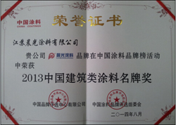 8月27日,“2013中国涂料品牌榜”揭晓。江苏PA视讯在线官网涂料有限公司凭借在品牌知名度、创新力等方面的优秀表现,一举斩获中国建筑类涂料名牌奖这项大奖。图为江苏PA视讯在线官网涂料有限公司此次颁奖获得的荣誉证书。